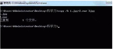 定位到正确目录后 键入copy /b (图片名称).jpg+(压缩包名称).rar (生成后图片名称).jpg,例如:将1.rar合并到1.jpg中去,就要键入copy /b 1.jpg+1.rar 2.jpg(注意:键入以上任意名称均要写全文件名,不能省略文件的拓展名