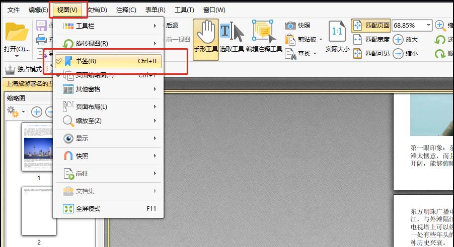 1、首先我们准备一个软件跟一个PDF文件,PDF文件的编辑是需要使用软件的,在电脑中下载一个PDF编辑器,然后在编辑器中找到书签工具,找到编辑器中的视图工具,我们可以看到视图工具的下拉菜单中就有我们需要的书签工具。然后点击书签工具。