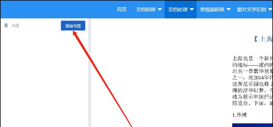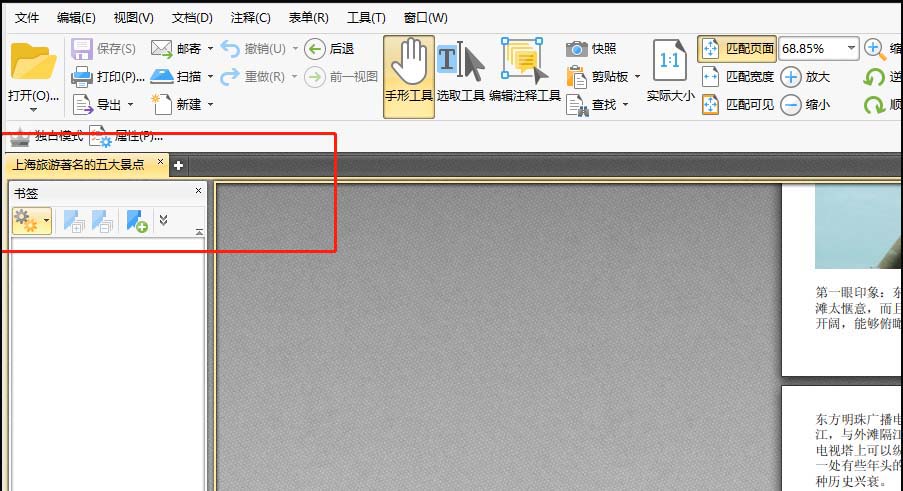 2、点击书签工具之后我们可以看到编辑器左边原本的页面缩略图的位子换成了书签。