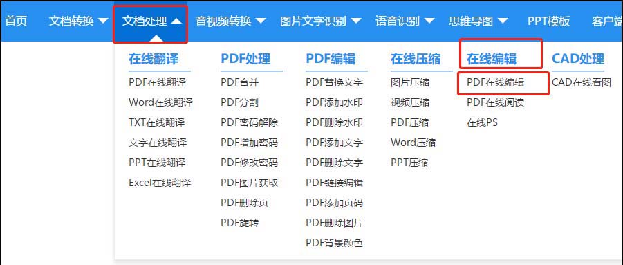 5、如果不能下载软件的,也可以使用在线编辑器在网上搜索一款PDF在线编辑器,之后点击打开。打开之后选择文档处理中的PDF在线编辑工具。