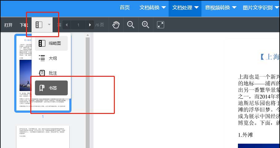 6、点击之后把PDF文件在在线编辑器中打开。打开之后点击左边的缩略图工具,可以看到缩略图工具中是书签工具,点击书签。