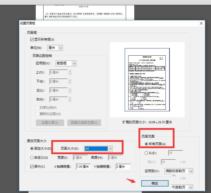 4、然后【页面大小】那里选择A4,并且选中【所有页面】前面的复选框,然后点击【确定】