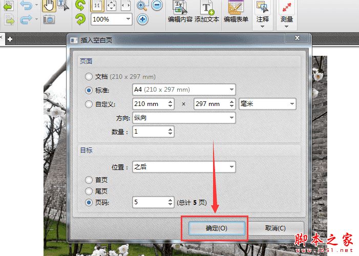 我们接着进入插入空白页界面之后,首先需要选择插入页面的格式,然后点击"页码"选项,选择需要插入的位置,最后点击"确定"按钮,即可成功将新的文档页面插入PDF文件当中。