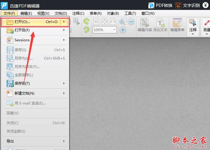 我们先打开迅捷pdf编辑器编辑软件,然后我们点击"文件"里的"打开"按钮,将需要进行编辑的PDF文件打开。