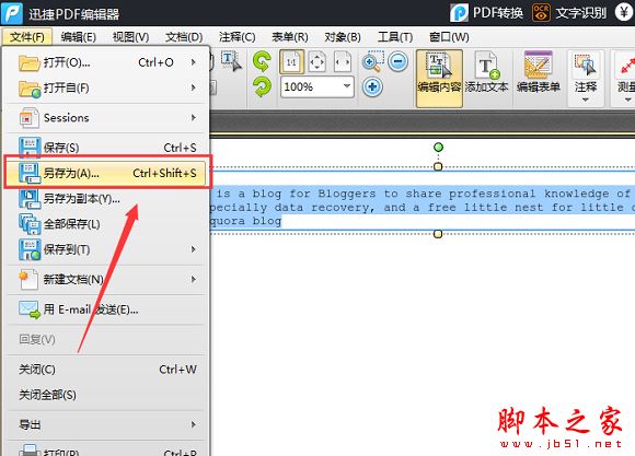 最后我们编辑完成后,点击界面的"另存为"选项,对新建的PDF文件进行保存。