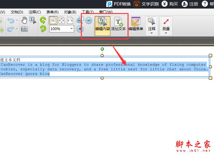 这时候成功新建PDF文档之后,如果想要对PDF文档进行编辑,那么可以点击界面的"编辑内容"选项进行编辑操作。