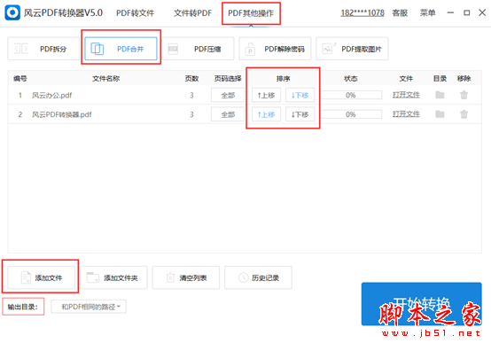 1、 打开风云PDF转换器,点击顶部菜单栏的【PDF其他操作】-【PDF合并】。添加好需要合并的两个或多个PDF文件,并设置好输出目录。这里需要注意的是要注意好文件的排序,这个会直接影响到合并后的文字顺序。