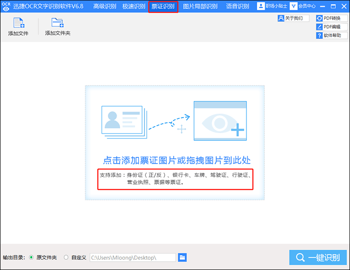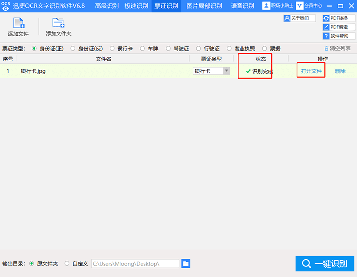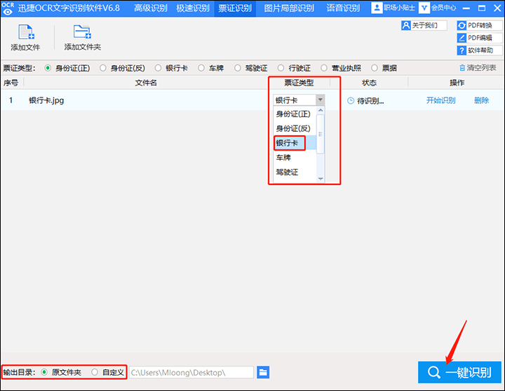 3、打开添加上的银行卡照片进入到软件的识别页面,设置一下"票证类型以及输出目录"设置完成之后点击【一键识别】按钮;