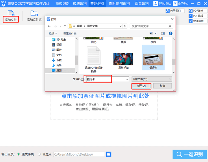 2、点击软件左上角的【添加文件】按钮,把准备好的需要识别银行卡照片添加上去;