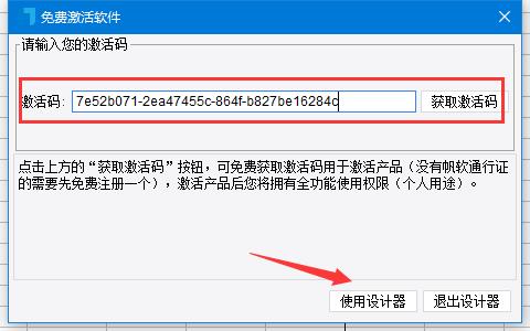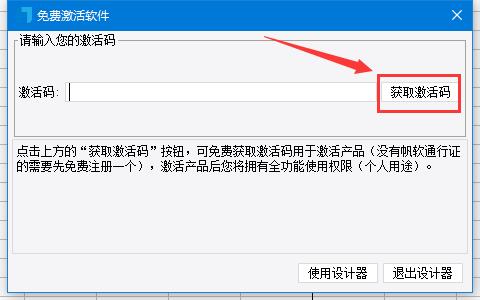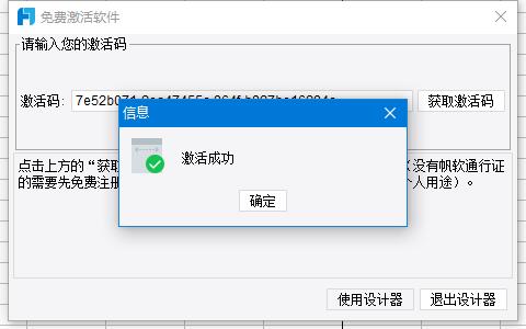 2、会弹出如下图提示填入电话号码及获取的验证码,点击开始免费试用,之后便会收到一个免费的激活码,将激活码填入上图的位置里,点击使用设计器,即可破解成功,免费使用啦。