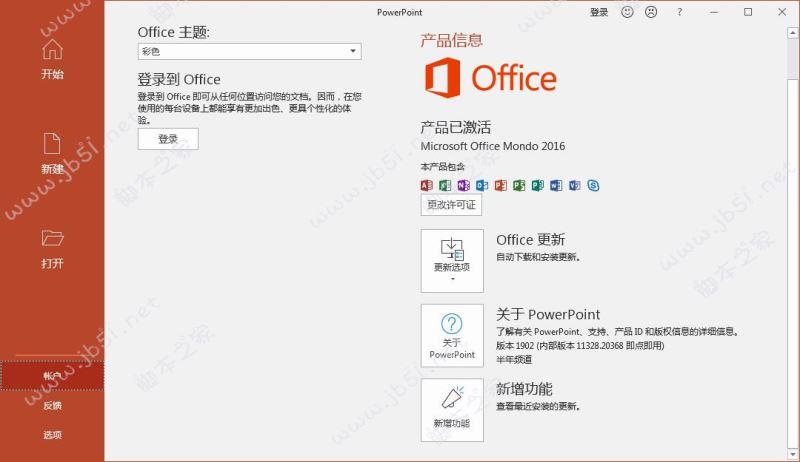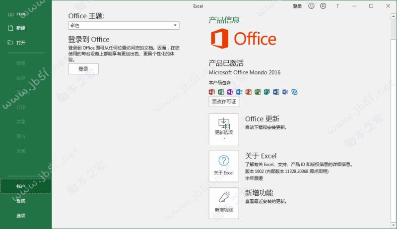 激活采用的是"伪Mondo方式",启动画面显示的是Office 365,激活信息里显示的是"Office mondo 2016 ",不过没关系,软件本质上还是Office 365,365的所有功能都可以使用。后续更新也可以在此页面完成,点击下面""office更新""即可。