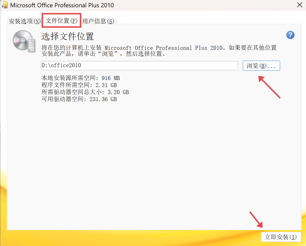 点文件位置,新建一个文件夹,Office2010放在d盘,然后点立即安装