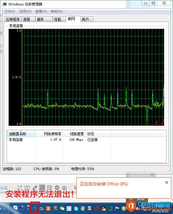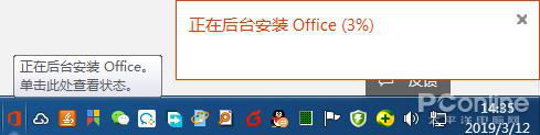 就算是关闭了 Office 365 的安装窗口,安装任务仍不会退出。Office 365 的安装程序会最小化成为任务栏的一个小图标,而且没有关闭机制,点击只能够查看安装进度。