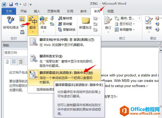 1.在文档中,首先要切换到"审阅"选项卡中,在右侧你会发现有一个"翻译"按钮,对这就是我们需要的功能了,点击它之后选择"翻译屏幕提示[英语助手:简体中文](M)",如此操作就可以启动屏幕取词功能啦.