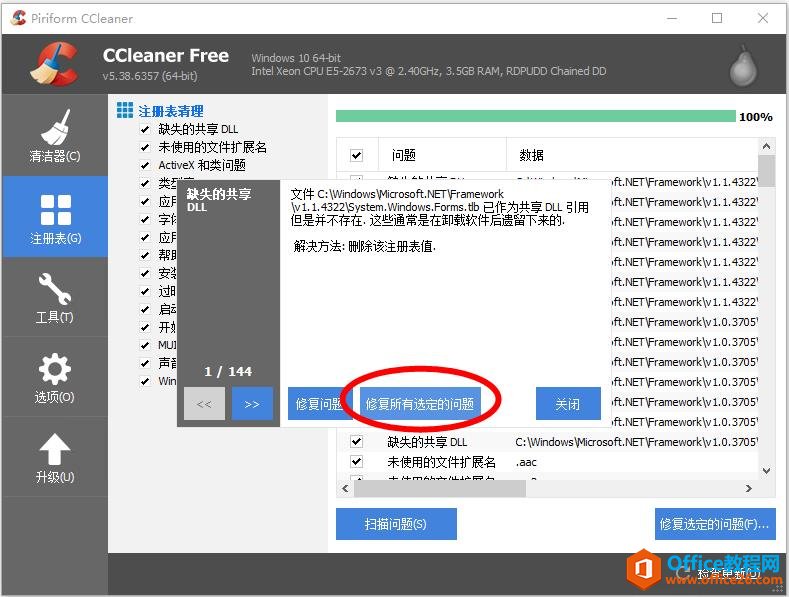 4. 扫描完成,点击修复,可以对现有的问题注册表进行备份,也可以点击否,然后选择修复所有选定的问题;问题修复完成点击关闭。