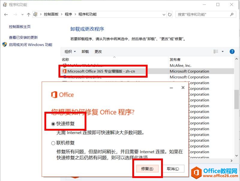 6. 注册表修复完成,然后到控制面板–程序功能–找到office365,点击更改,选择快速修复,等待修复完成就好了。