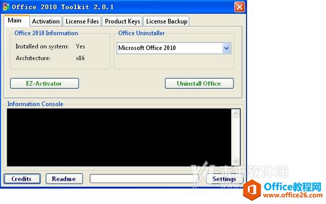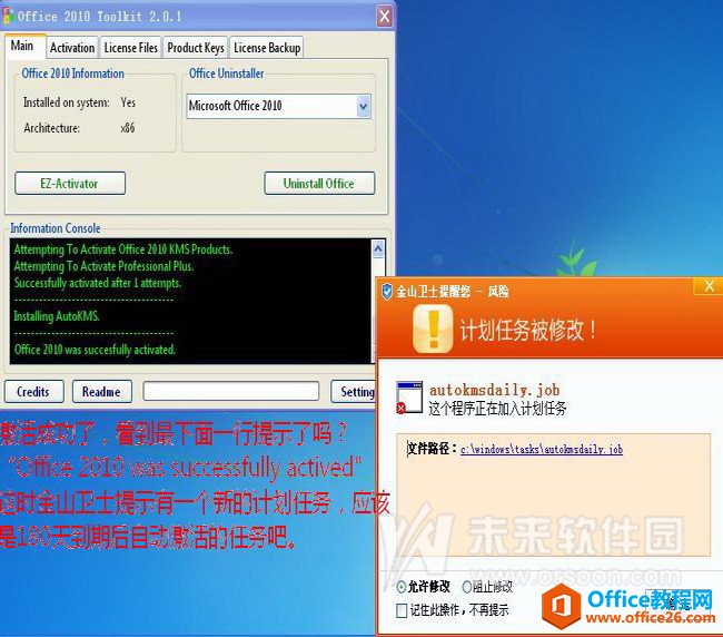 激活非常的简单,可以说是一键激活.首先下载Office 2010 Toolkit, 单击下面的"EZ-Activator" 按钮,工具会自动检测系统安装的Office程序并进行激活,稍后片刻,可以看到以下画面(Office 2010 was successfully actived).
