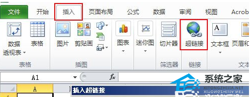 1、打开一个空白工作簿,在"Sheet2"工作表中的A1单元格中输入"Sheet1"工作表的名称,并为其建立超链接,链接到工作表"Sheet2"中。点击【插入】-【超链接】即可添加链接,如图1所示。