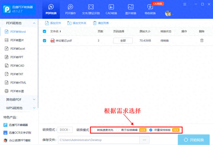 点击[PDF转Word]→上传文件→开始转换