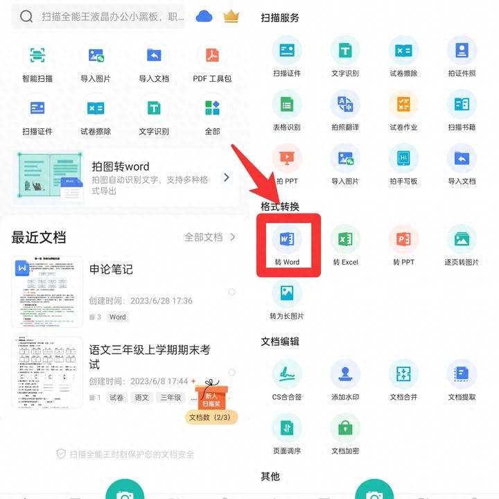 支持移动版、客户端、网页版同步使用,扫描功能超强,主要功能是证件扫描、文字识别等。除了各类扫描服务外,还有格式转换、文档编辑功能,[转Word]就是功能之一,是一款比较值得下载的软件!