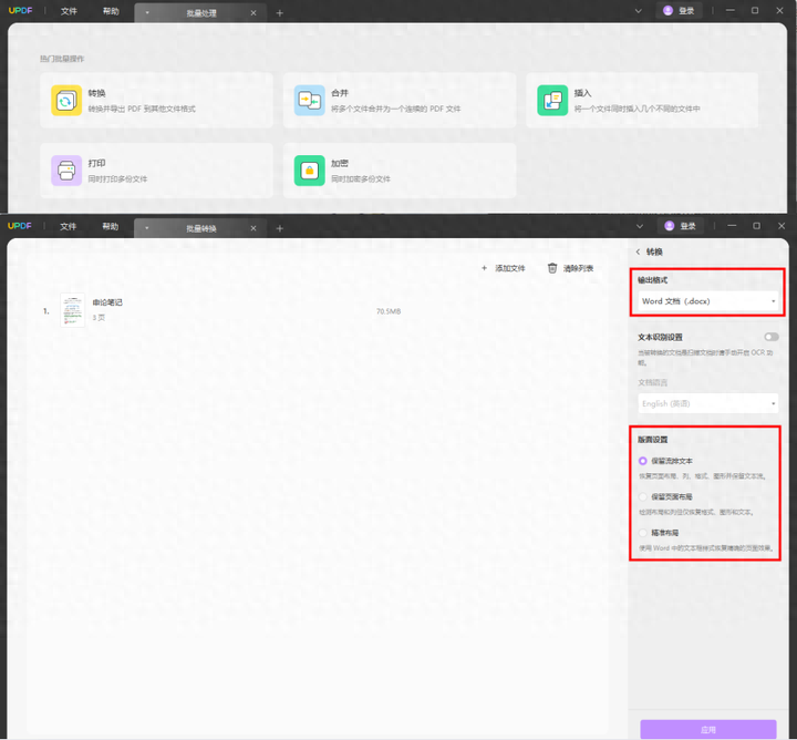点击[批量]→[转换]→上传文件→应用
