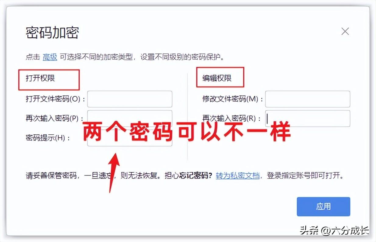 可以设置打开密码或编辑密码,可以只设置一个密码或者两个不同的密码。