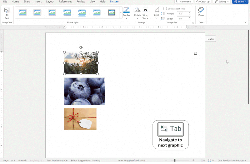 对于包含多个图形的文档,可以使用 Tab 键导航到文档中的下一张图片。