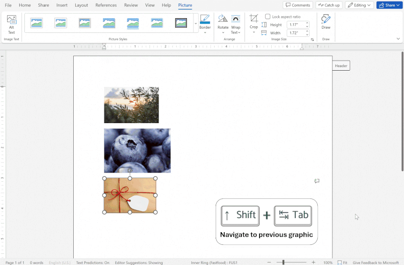 对于包含多个图形的文档,可以按下 Shift+Tab 组合键,访问上一张图片。