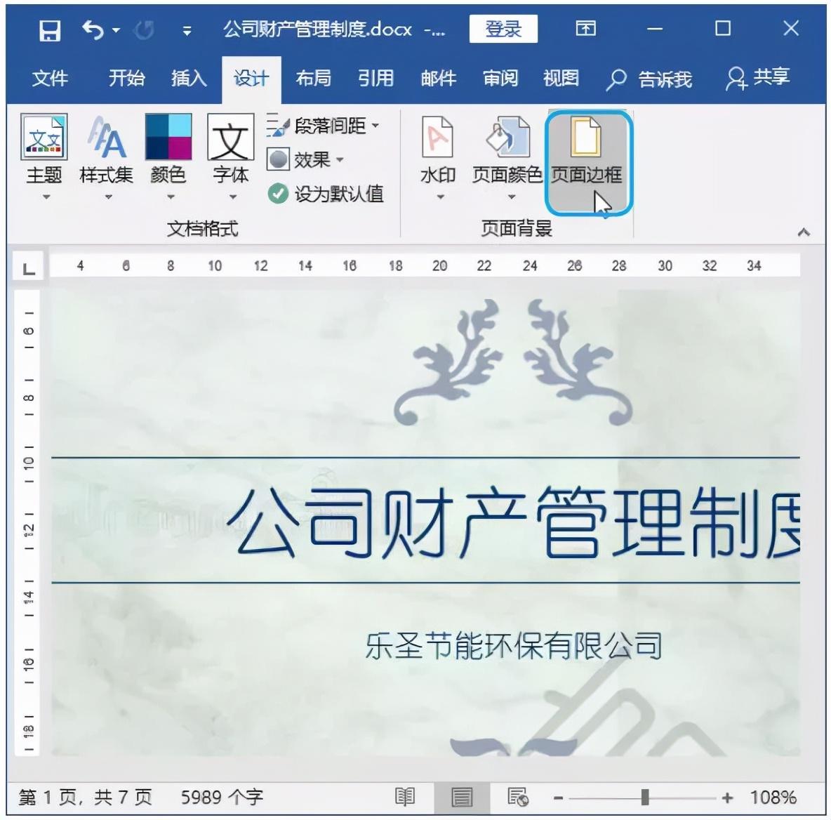 Step01 执行页面边框操作。在“公司财产管理制度.docx”文档中单击【设计】选项卡【页面背景】组中的【页面边框】按钮。