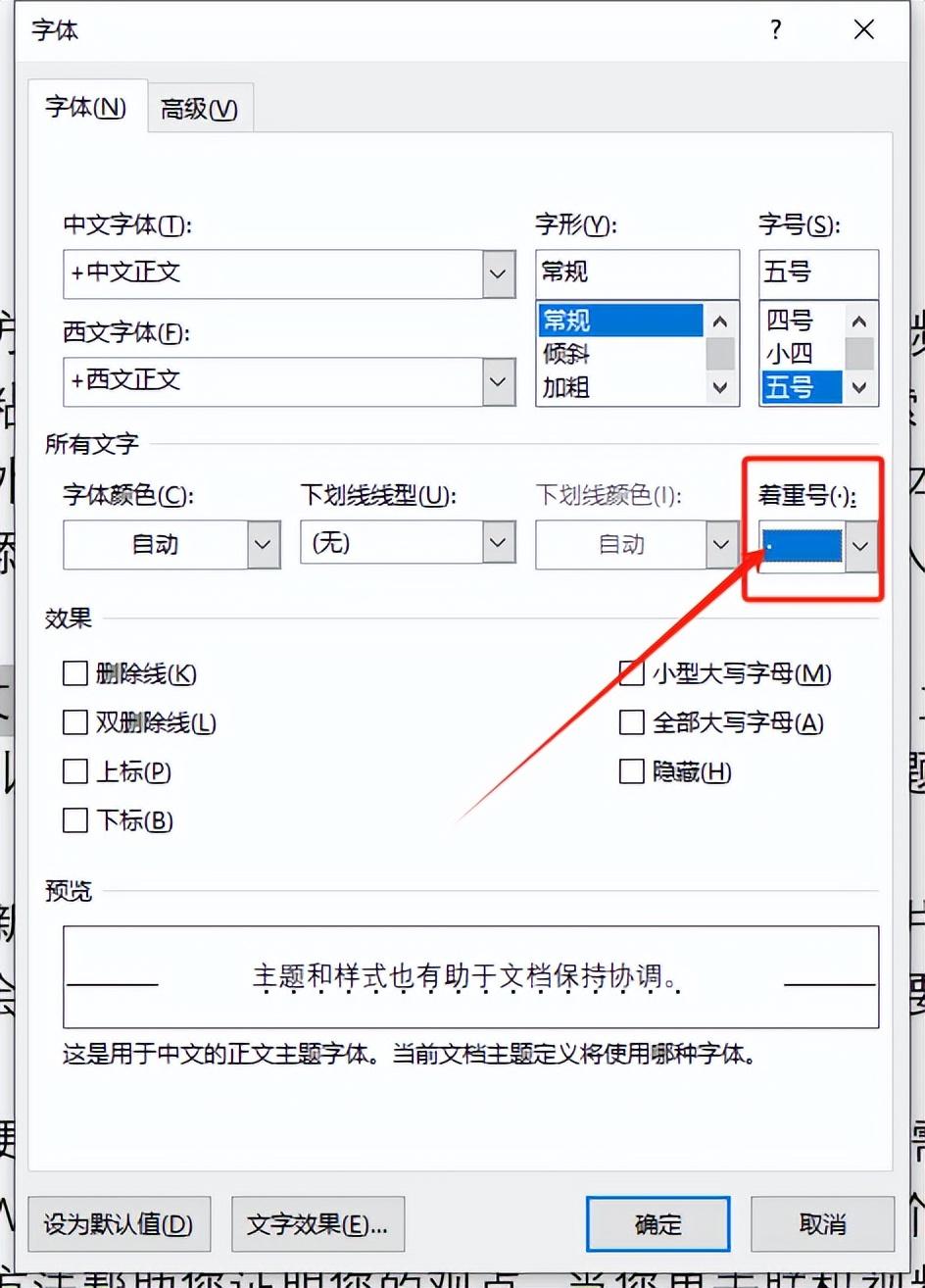 3. 在弹出的字体对话框中,找到“所有效果”区域,选择“着重号”。