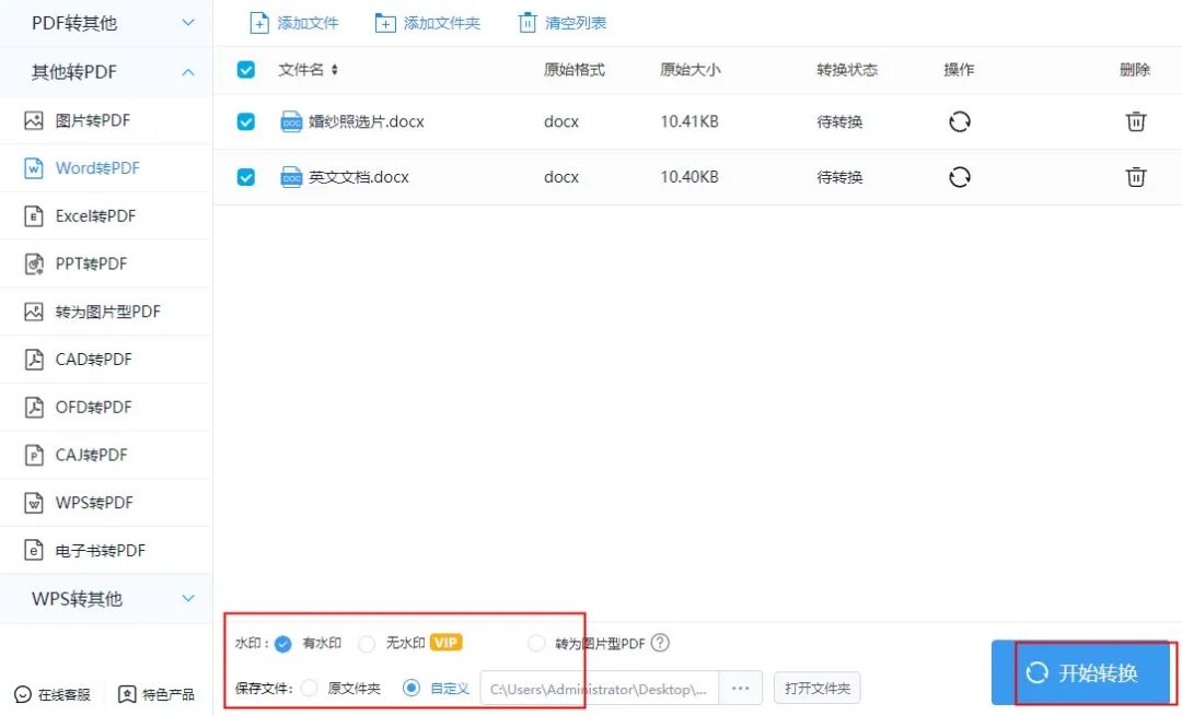 Word文件上传或,设置保存文件夹、是否添加水印、专为图片型PDF,点击【开始转换】按钮就可以啦!