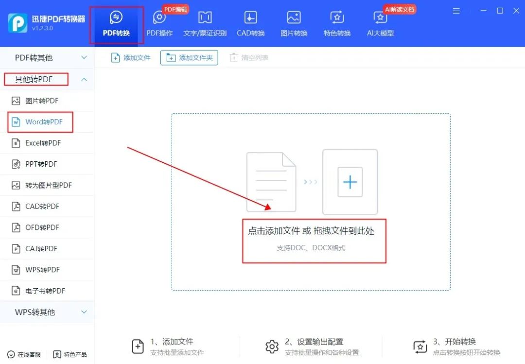 打开软件后,点击首页的【PDF转换】—选择【其他转PDF】中的【Word转PDF】功能,导入word文档即可;