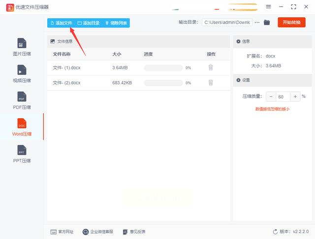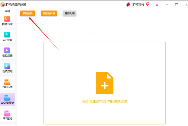 3. 添加文件:点击左上角的【添加文件】按钮,然后上传你准备好的Word文档到软件中。支持批量压缩。