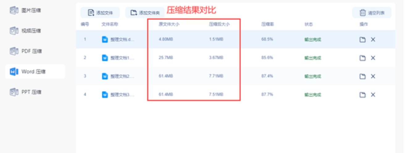在软件界面上,您可以直接观察到原始文件大小与压缩后文档大小之间的差距,这样就能迅速比较两者的相似度。通常情况下,压缩比率都可以达到60%以上。