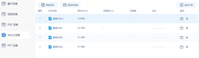 首先,下载并安装"WORD快捷压缩器"软件,这个程序集成了多种文档压缩功能,如图片压缩、视频压缩、PDF压缩等。在软件界面中,选择【Word压缩】选项即可进入文档压缩页面。随后,您可以批量上传需要压缩的Word文档。
