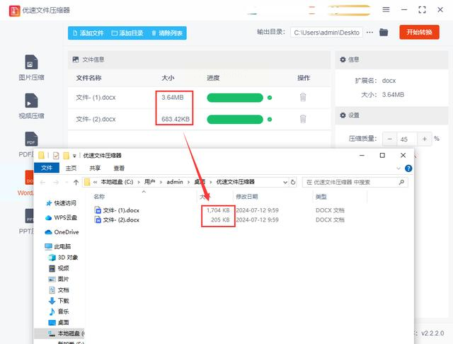 等待完成之后,你就可以看到软件自动生成一个输出文件夹了。在这里,你会发现压缩后的Word文档,它的体积将显著减小。通过对比原文件和压缩后的文件,你就会明白"优速文件压缩器"有多强大。