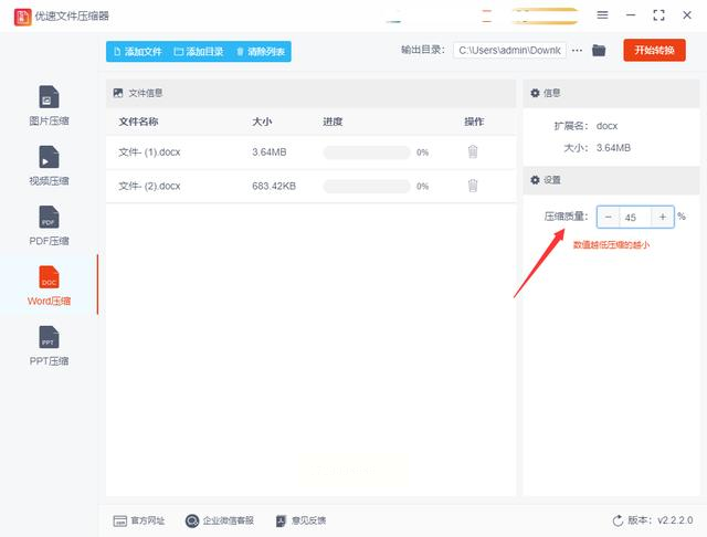当所有的Word文档都导入完毕后,您需要根据实际需求来调整下方的压缩质量设置。这一步非常重要,因为它会直接影响到最终的压缩效果。记住,压缩质量越小,文件的内存大小也会变小。