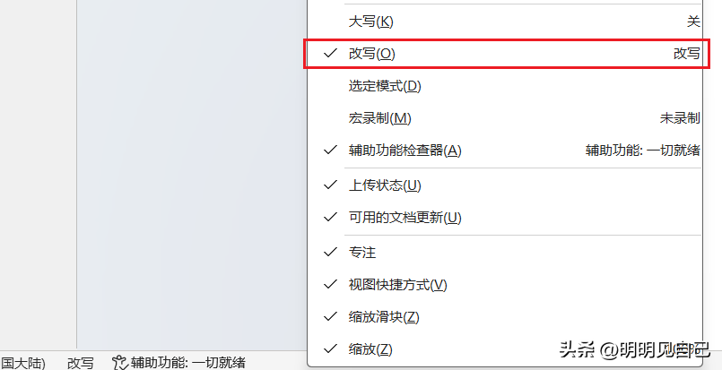 如果找不到,可以在状态栏右键,点击“改写”选项,使其在状态栏中显示。
