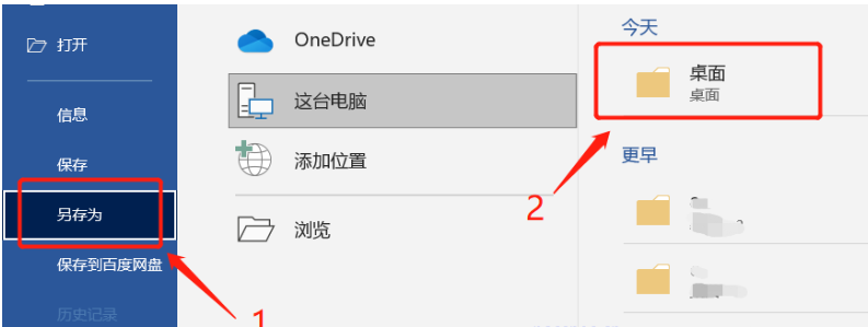2、打开Word文档后,点击左上角的【文件】选项,然后选择【另存为】,再选择保存位置。
