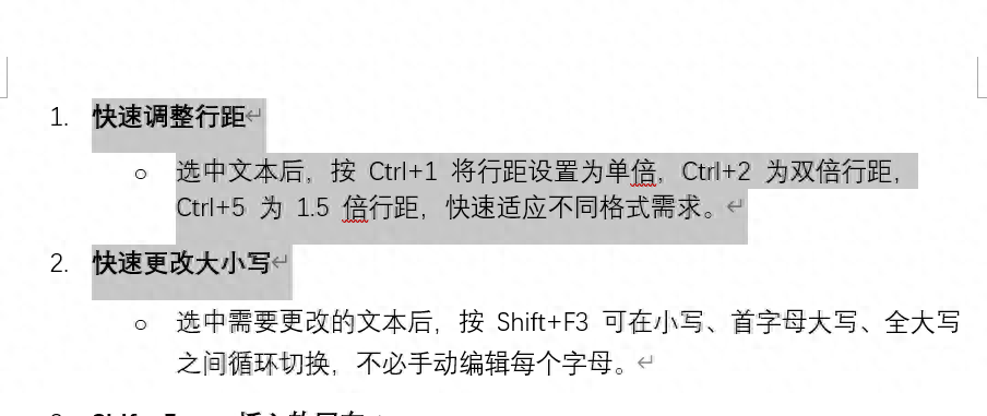 选中文本后,按 Ctrl+1 将行距设置为单倍,Ctrl+2 为双倍行距,Ctrl+5 为 1.5 倍行距,快速适应不同格式需求。