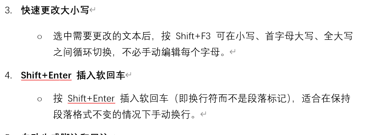 按 Shift+Enter 插入软回车(即换行符而不是段落标记),适合在保持段落格式不变的情况下手动换行。