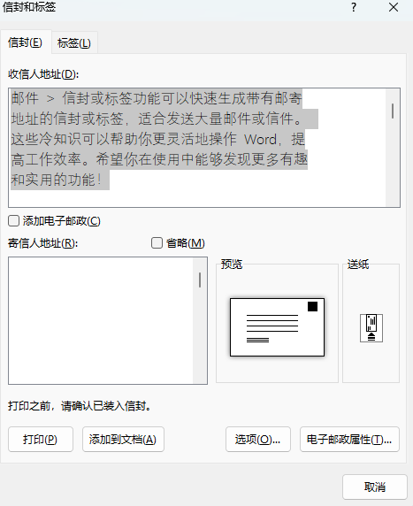 - 邮件 > 信封或标签功能可以快速生成带有邮寄地址的信封或标签,适合发送大量邮件或信件。