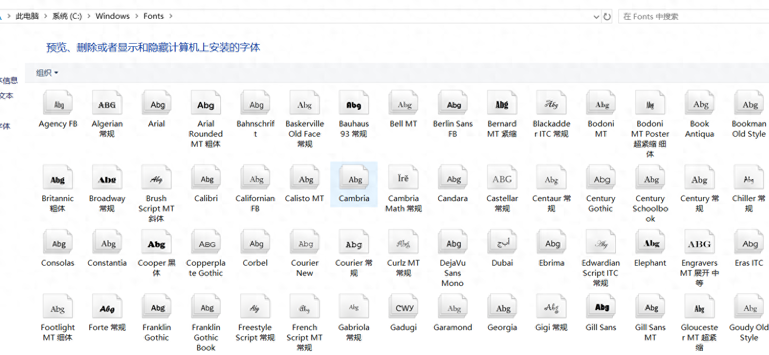 在windows中, 所有字体都存储在C:WindowsFonts 文件夹中。打开文件夹可以看到现在已经支持的字体了。