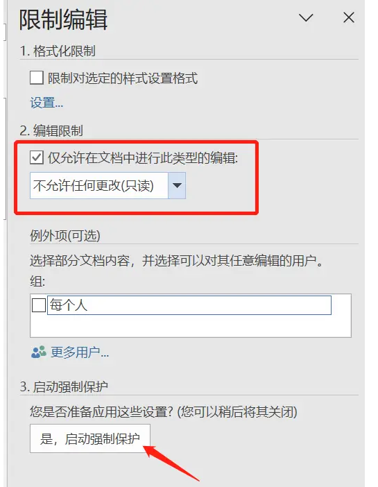 2、设置限制:在弹出的“限制编辑”提示框中,勾选“仅允许在文档中进行此类型的编辑”选项。在下拉框中,选择“不允许任何更改(只读)”选项。