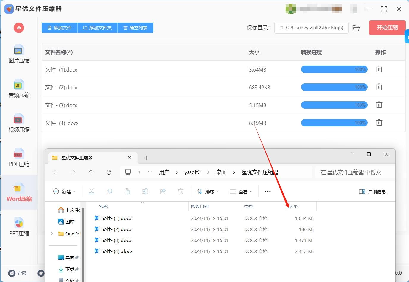 压缩完成后,软件会自动打开输出文件夹,可在此找到压缩后的 Word 文档,并与原文件大小进行对比,检查压缩效果 。