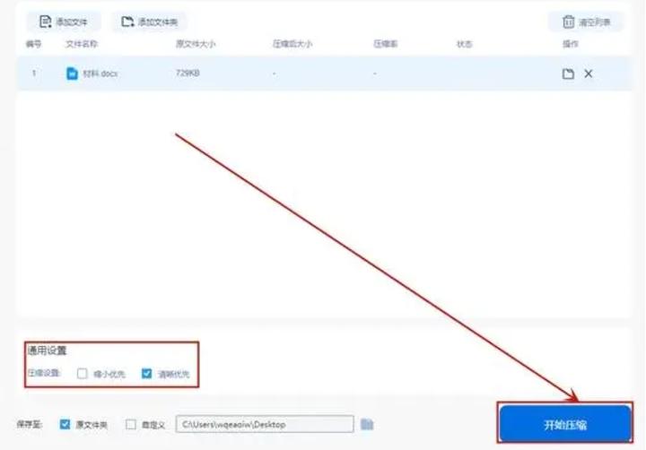 文件添加后,可设置压缩模式,工具中默认的压缩模式是 “缩小优先”,也可选择其他压缩模式。