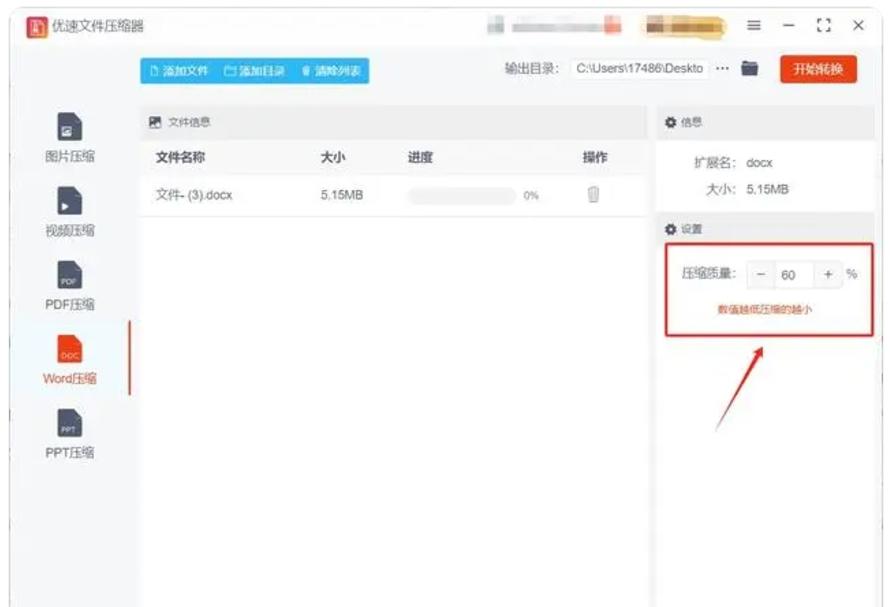 第三步,文件添加成功后,接下来就是设置压缩参数的步骤。在软件底部,你会看到“压缩质量”的设置选项。压缩质量数值越低,Word文件的体积将越小,但可能会牺牲一些排版和格式的精细度。如果你的文档对格式要求不高,可以选择较低的压缩质量,以获得更小的文件大小。如果需要保持较高的质量,则可以选择中等或高质量压缩选项。