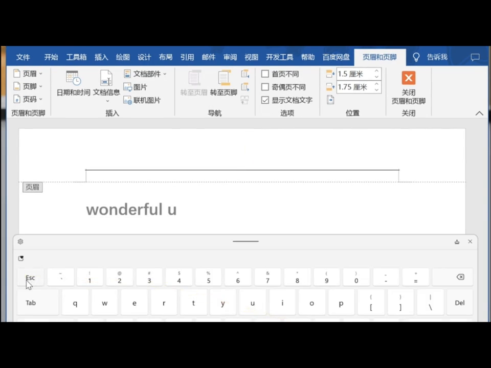 1. 页眉编辑:可以双击 Word 顶部进入页眉编辑状态,一般情况下退出是双击空白处,但要是底部有水印,双击就不太管用,这时可按 esc 键(键盘最左侧)退出页眉编辑状态。
