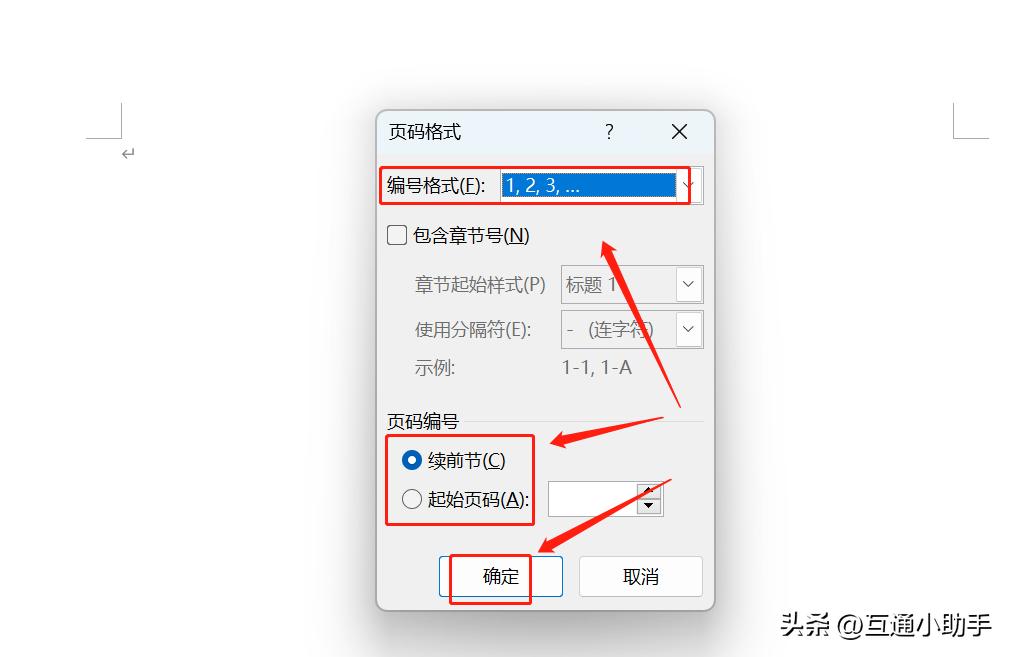4、进入页码格式,输入编号格式、页码编号,点击“确定”。