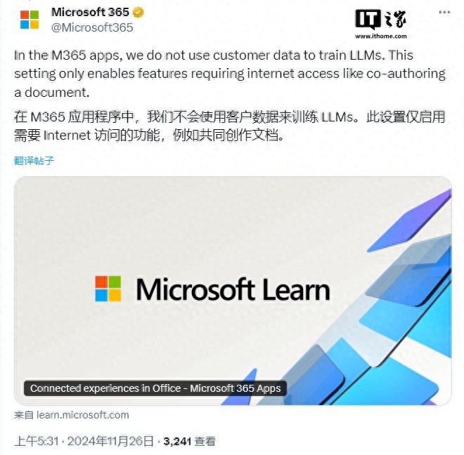 对此微软官方澄清称,该公司不会使用这些用户的数据来训练其大型语言模型(人工智能模型)。